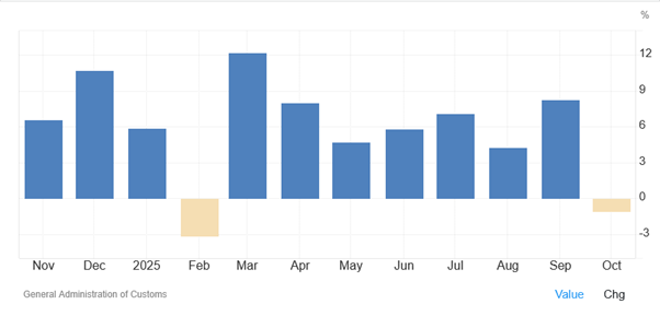 China’s October trade figures revealed a surprise contraction in exports — the first decline since February — signaling renewed fragility in the world’s second-largest economy. Outbound shipments fell 1.1% year-over-year, dragged by a steep 25% plunge in exports to the United States.